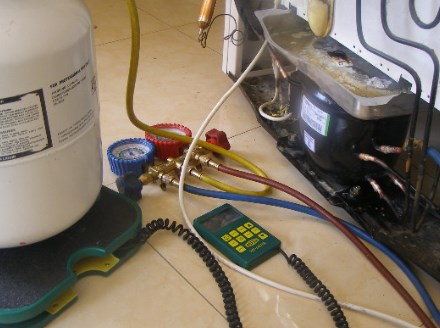• Холодильник заправляется фреоном. На этом этапе мастер заправляет систему хладагентом подходящей для данной марки и модели холодильника маркировки. Баллон с хладагентом через клапан Шредера подключается к агрегату, а затем открывается вентиль на баллоне. Заправка осуществляется по массе или по давлению. В первом случае баллон с фреоном помещается на весы, и мастер отмеряет необходимое количество хладагента по массе. Во втором – баллон соединяется с холодильником через манометр, с помощью которого специалист и контролирует уровень давления фреона в системе.