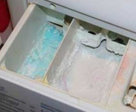 • Не забился ли в дозаторе канал смыва порошка в бак? В этом случае вода попадает в дозатор, но из-за забитого канала не может «унести» весь порошок в барабан. Чтобы этого избежать, рекомендуется периодически доставать лоток для моющих средств и промывать его под теплой проточной водой.